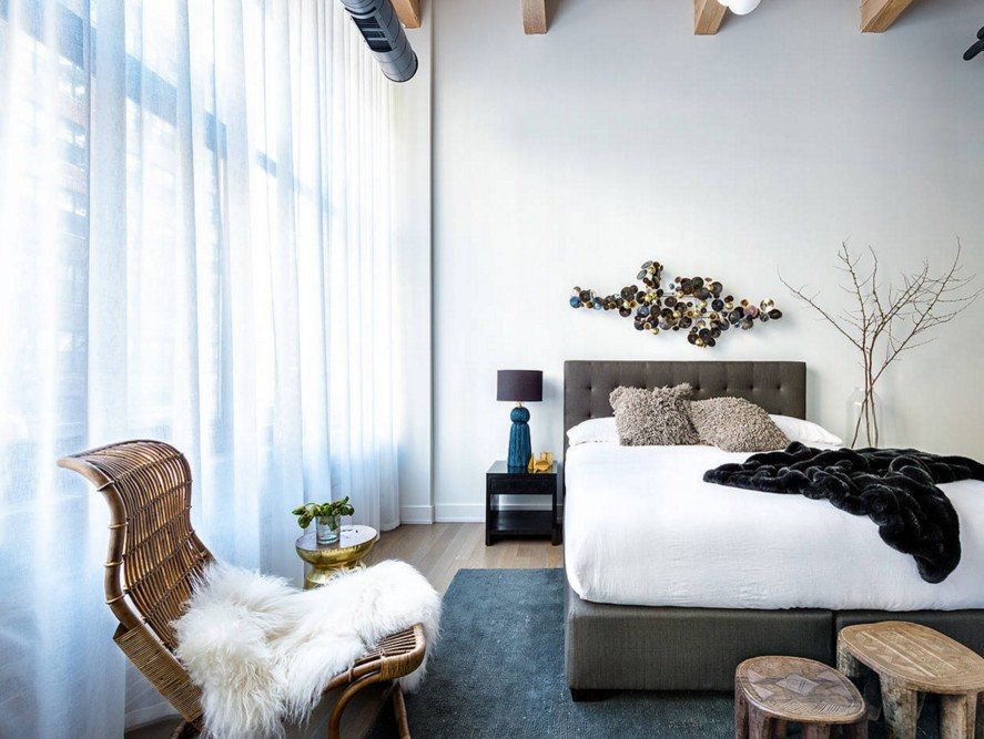 Совмещение разных материалов, восточных и старинных элементов делает этот стиль незаменимым при оформлении спальни для творческих натур. Широкая удобная кровать, массивные декоративные элементы и аксессуары вполне допустимы в таком интерьере