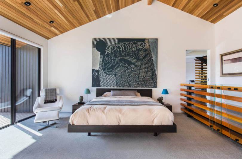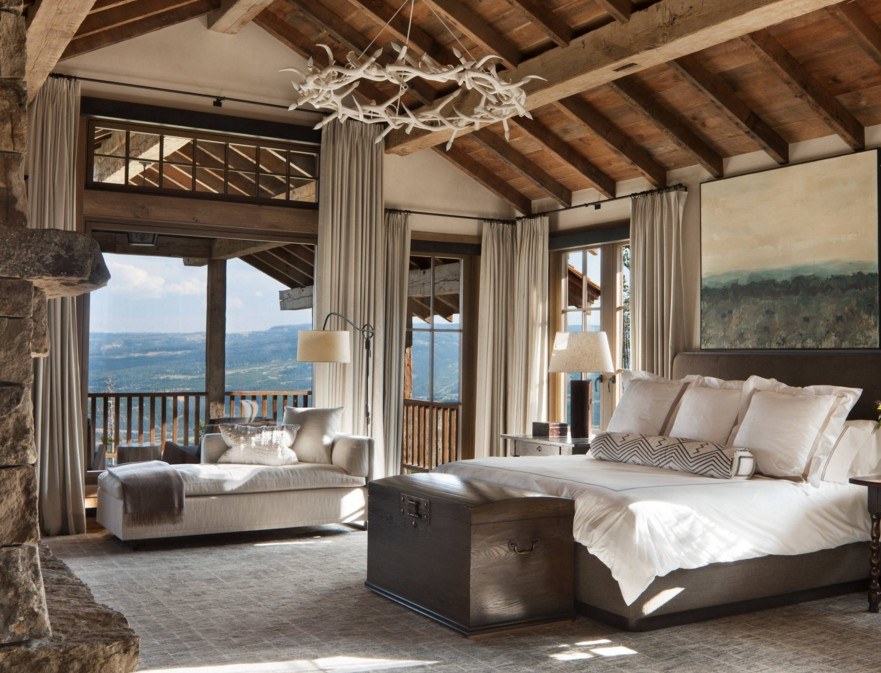При таком дизайне спальня приобретает эко-черты, а потолок кажется выше.
