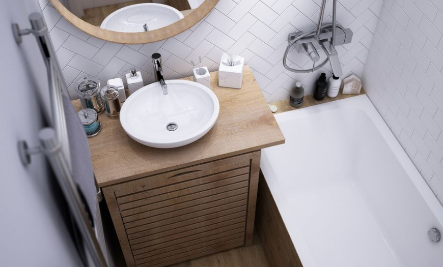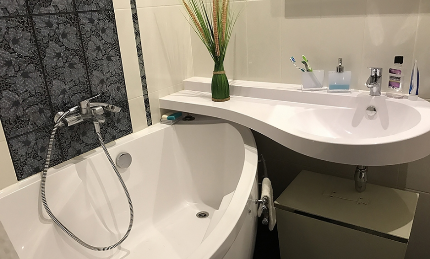Если в комнате мало места для умывальника, то его располагают непосредственно над ванной. Такие модели меньше стандартных и хорошо вписываются в интерьер.