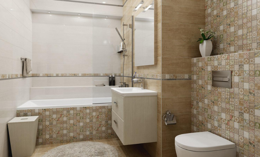 Стены ванной выложены мелкой плиткой с орнаментом