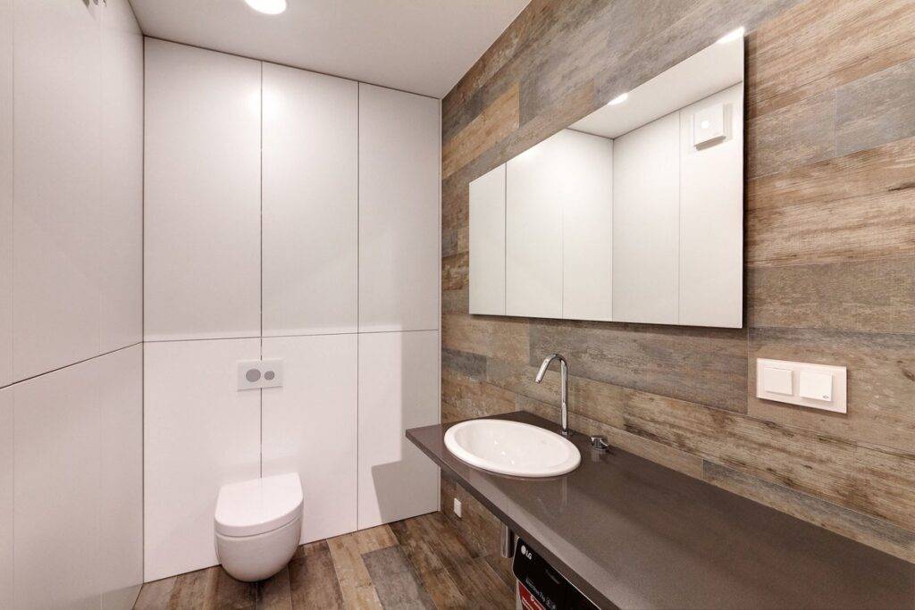 - Светлые цвета и плитка под светлое дерево — ванная в скандинавском стиле.