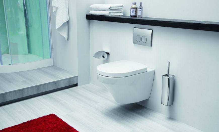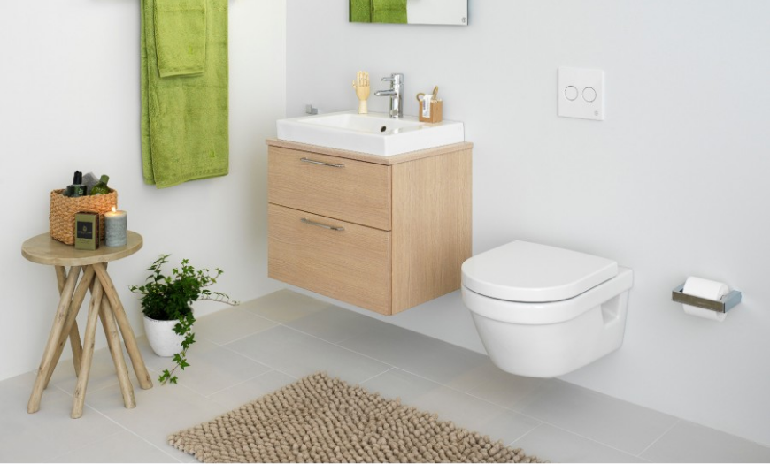 Туалет лучше выбрать подвесной (монтированный в стену), поскольку он более удобный и занимает меньше места. Кроме того, такая конструкция позволяет мыть пол под ним (грязь и влага не скапливаются вокруг). Свободный пол визуально делает пространство менее загроможденным.
