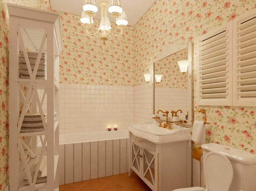 Это классический стиль, предполагающий использование светлых нежных тонов. В последнем могут помочь плитка с художественным панно, изящное обрамление зеркала, подвесные светильники, имитация фактуры камня на тумбе или плитке.