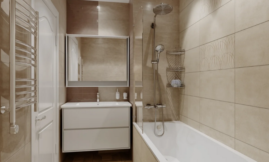 Постарайтесь использовать хромированные элементы и выбирать сантехнику с гладкой поверхностью. Правильно расположенное зеркало также визуально увеличит комнату.