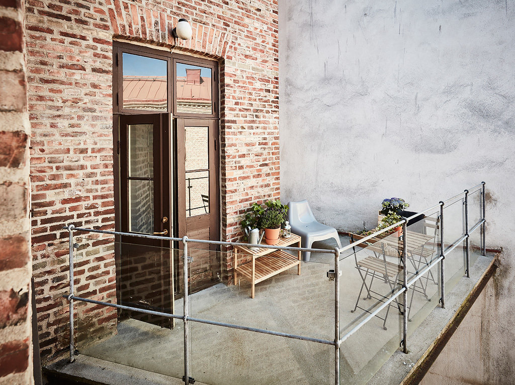 Стиль лофт характерен минимализмом и первозданностью материалов. На фото выше продемонстрирован вариант балкона, где стены выполнены из кирпичной кладки и штукатурки. В интерьере используются такие материалы как стекло, металл, пластик. Стиль лофт не терпит лишних украшательств — все строго и фактурно.