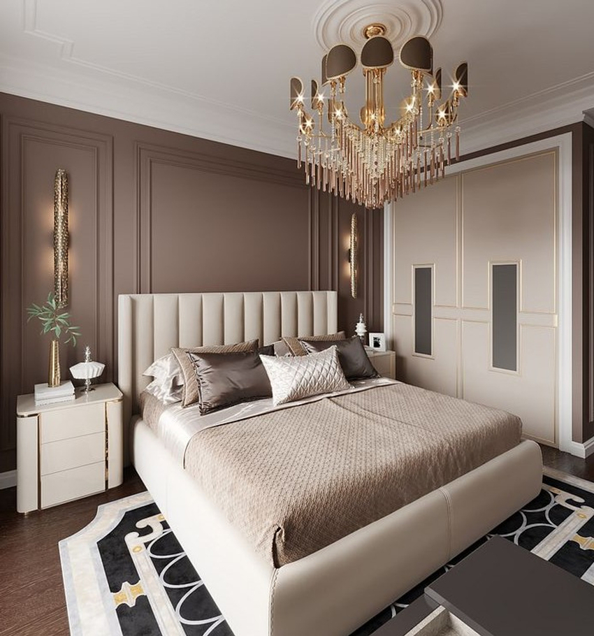 - Обязательно используют дополнительный свет – бра или торшеры у изголовья кровати, светильники у туалетного столика или зеркала.