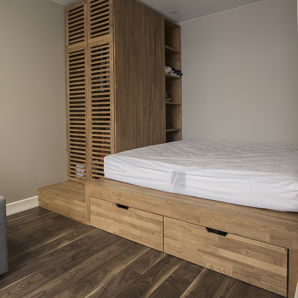 Вместо комода можно выбрать подиум, который имеет отделения для хранения, что помогает сэкономить пространство.