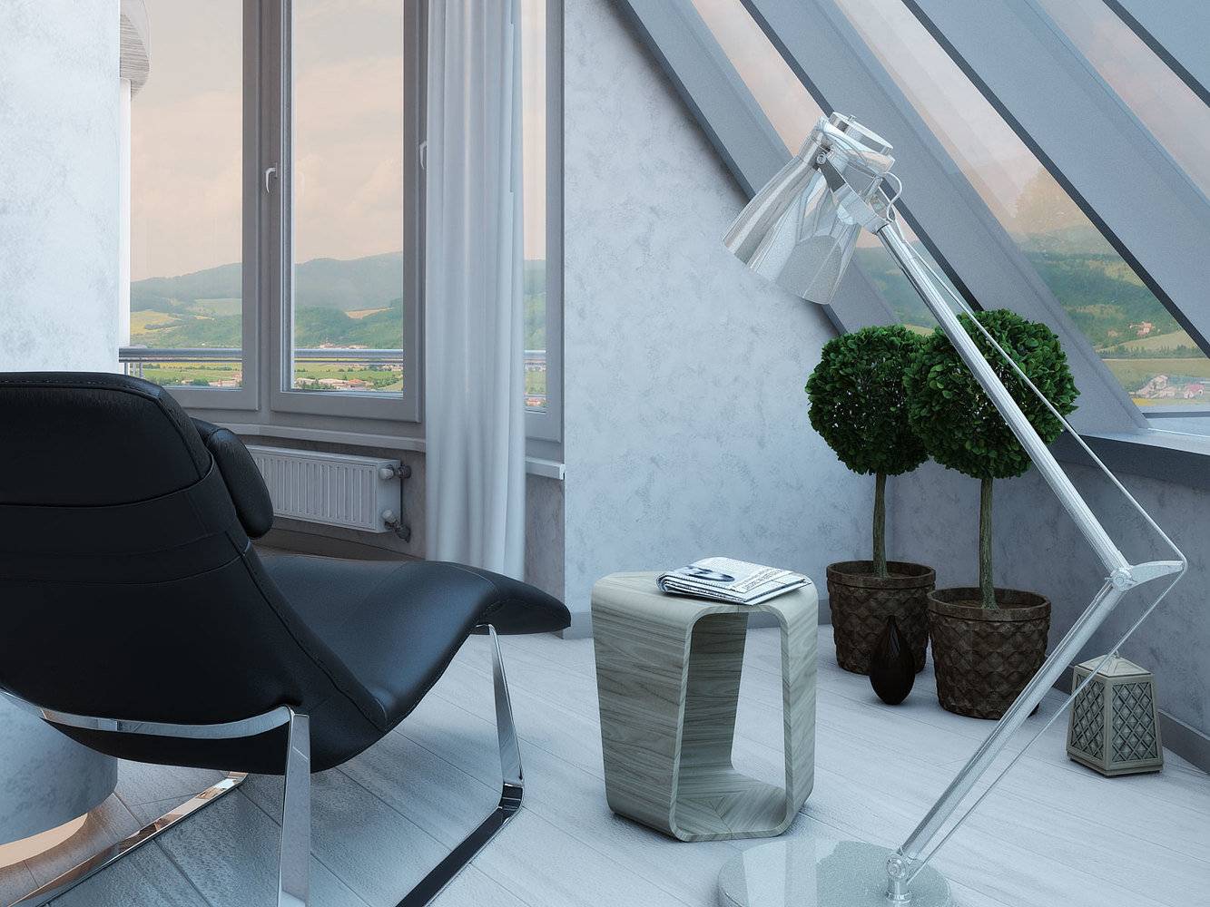 Интерьер балкона в стиле хай-тек отличается некоторым минимализмом. Элементы мебели и декора выполнены из таких материалов, как металл и кожа. Используются цветовые оттенки белого, бежевого, серого.