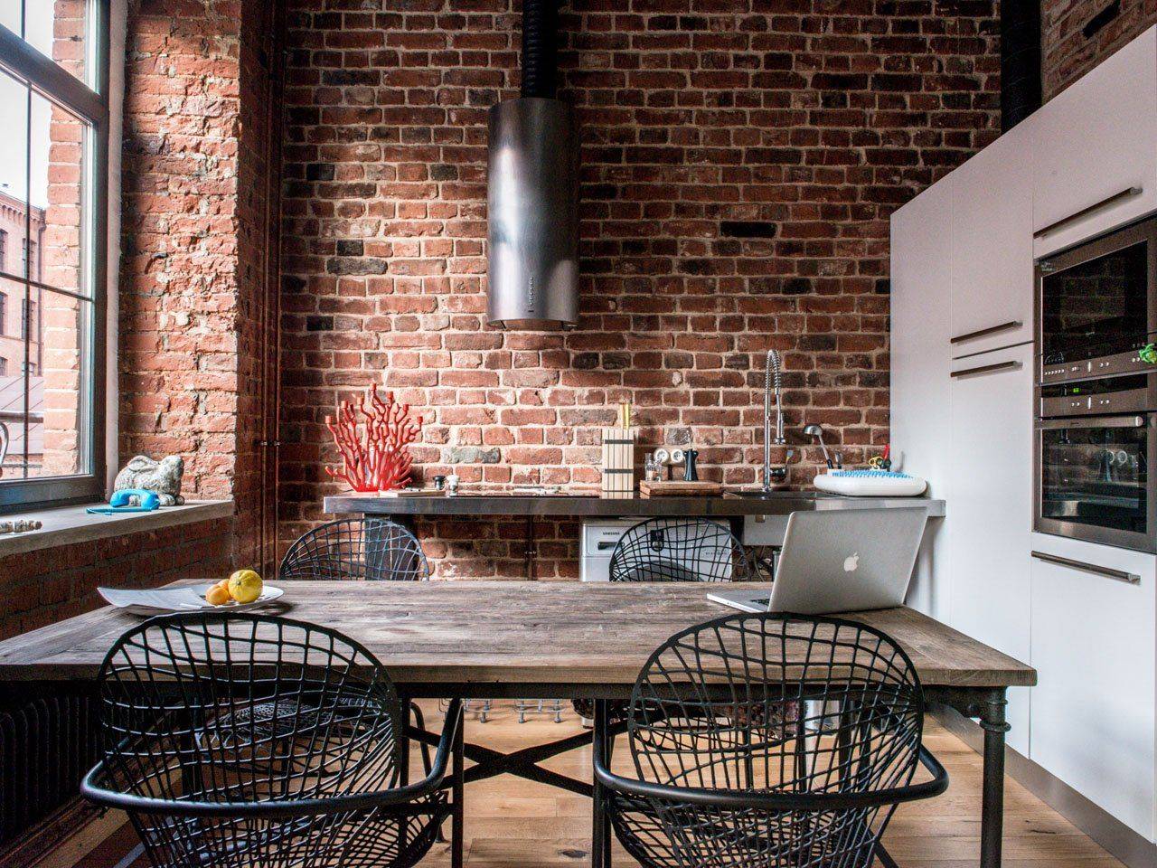В зоне кухни безупречно смотрится союз дерева и кирпича. Оформление интерьера индустриальной гостиной и кухни должно соответствовать общим особенностям стиля.