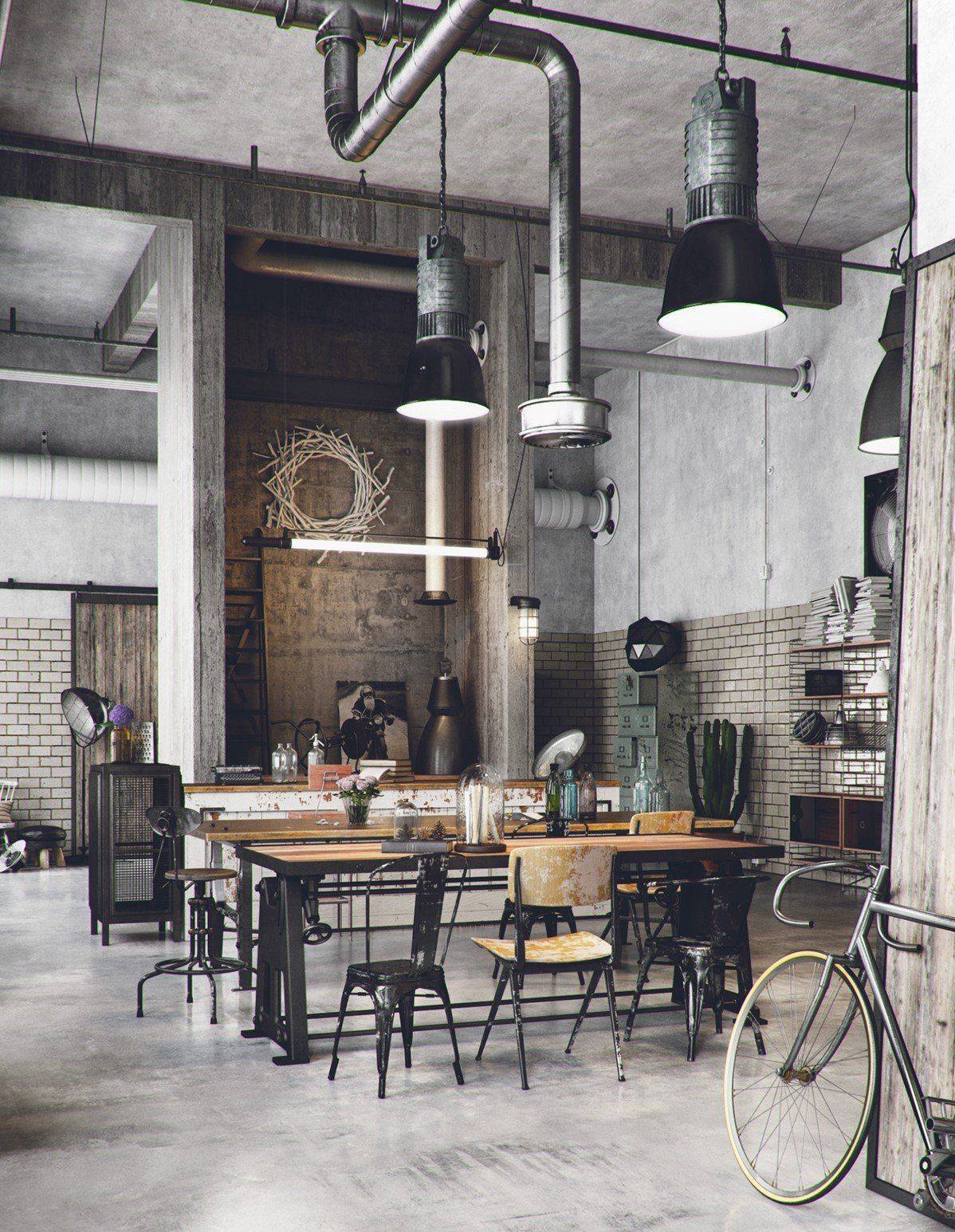 Контрастный индустриальный интерьер кухни Светлая кухня в индустриальном стиле Столовая и кухня в индустриальном стиле