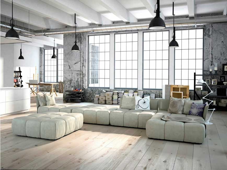 Поскольку индустриальный стиль создается на территории промышленных зданий, то и площади, необходимые для его создания в жилых помещениях, требуются соответствующие: от 100-200м². Высокие потолки, огромные окна, потолочные балки или трубы разного диаметра — обязательные атрибуты стиля «индастриал». Особенно выигрышно индустриальный стиль смотрится в помещениях типа лофт, который полностью отвечает концепции этого стиля.