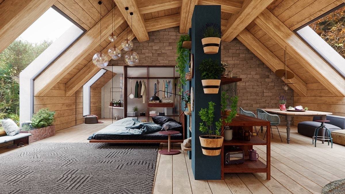 Удачное применение натурального камня и дерева в оформлении мансардного этажа частного дома