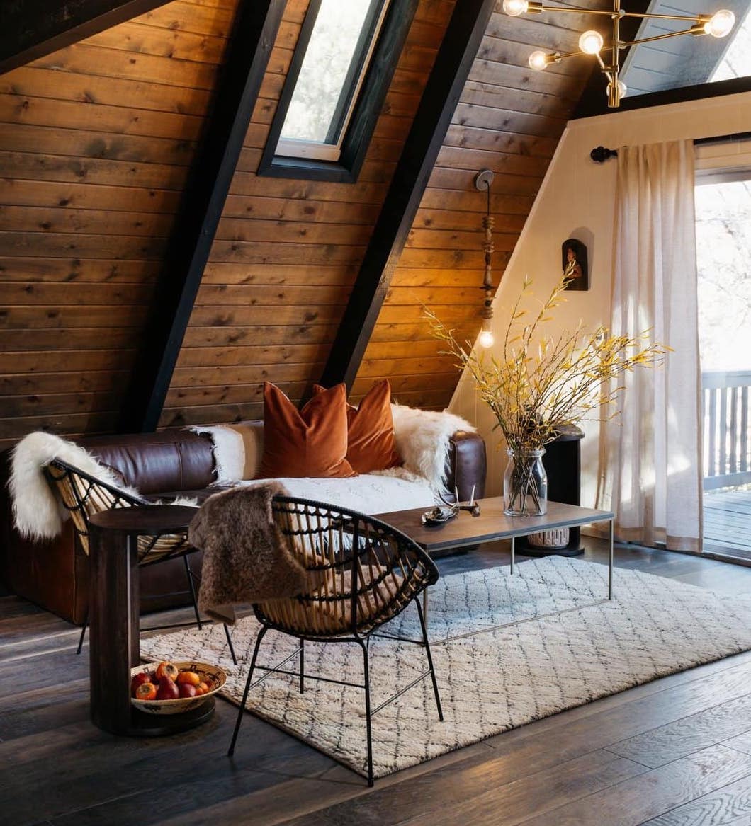 Интерьер гостиной в деревянном доме для мансарды можно выполнить в стиле лофт. Оставляют потолочные конструкции, для отделки вертикальных поверхностей берут стеновые панели под кирпич. Из-за особенностей помещения лучше не использовать темные оттенки. Светлые тона визуально увеличивают пространство.