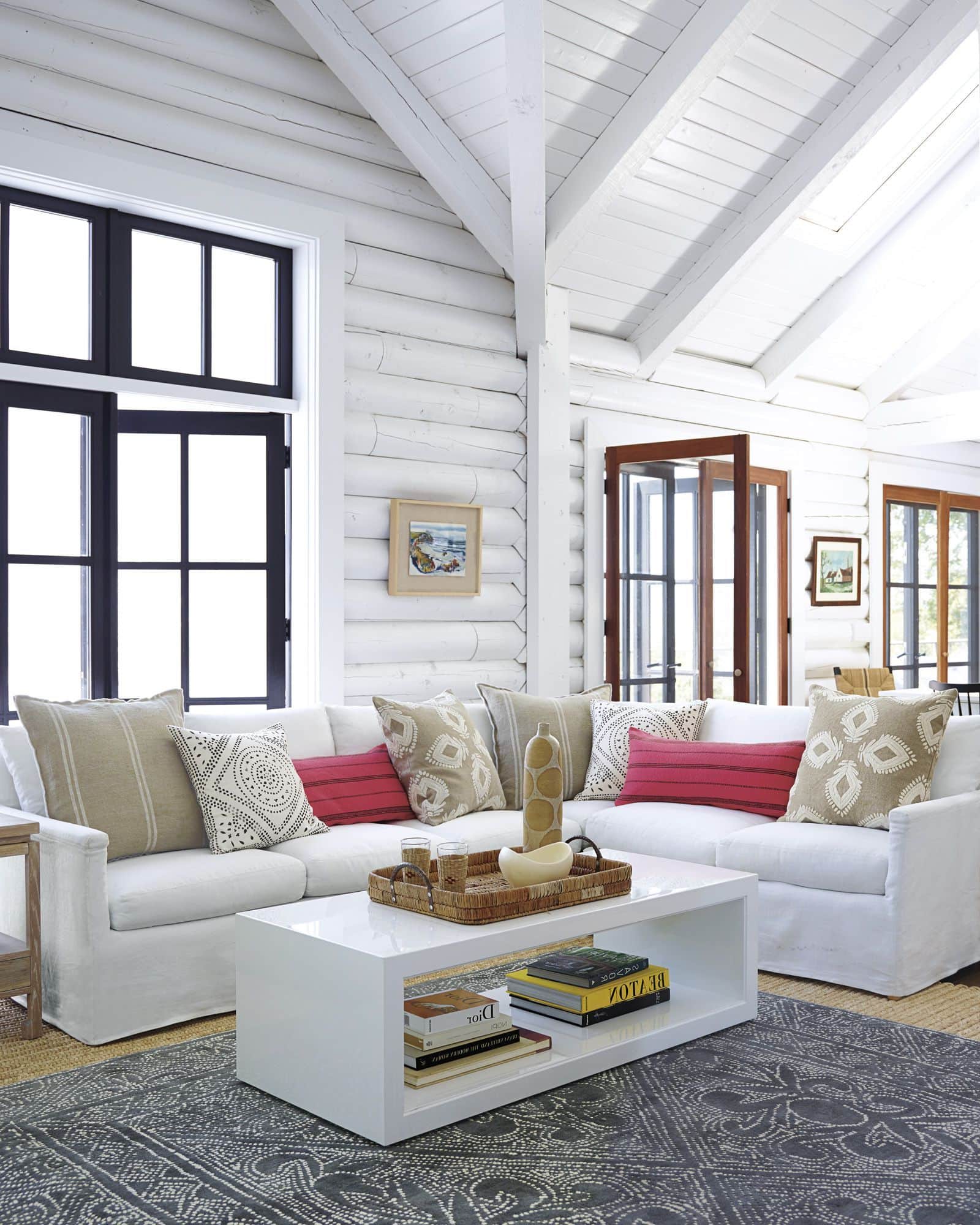 Просторная, светлая гостиная с выбеленными стенами и потолками смотрится поистине шикарно