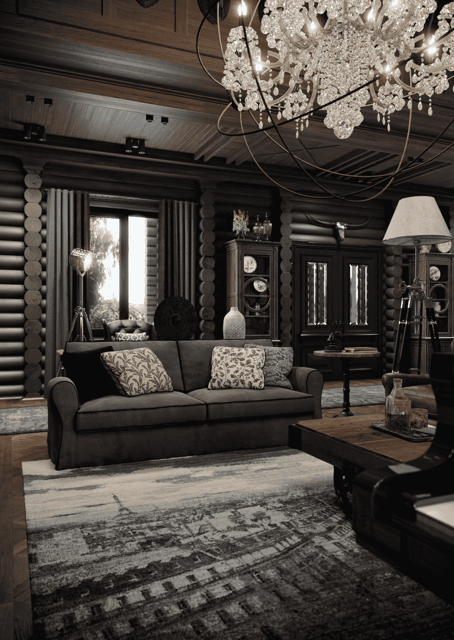 Гостиная — сердце дома. Поэтому очаг следует разместить именно здесь, чтобы в холодный зимний вечер вы могли сесть у камина с чашкой горячего чая и пледом. В зале также ставят большой комфортный диван, кресла (идеально кресло-качалку). Комнату украшают картинами, рогами, шкурами, цветами.