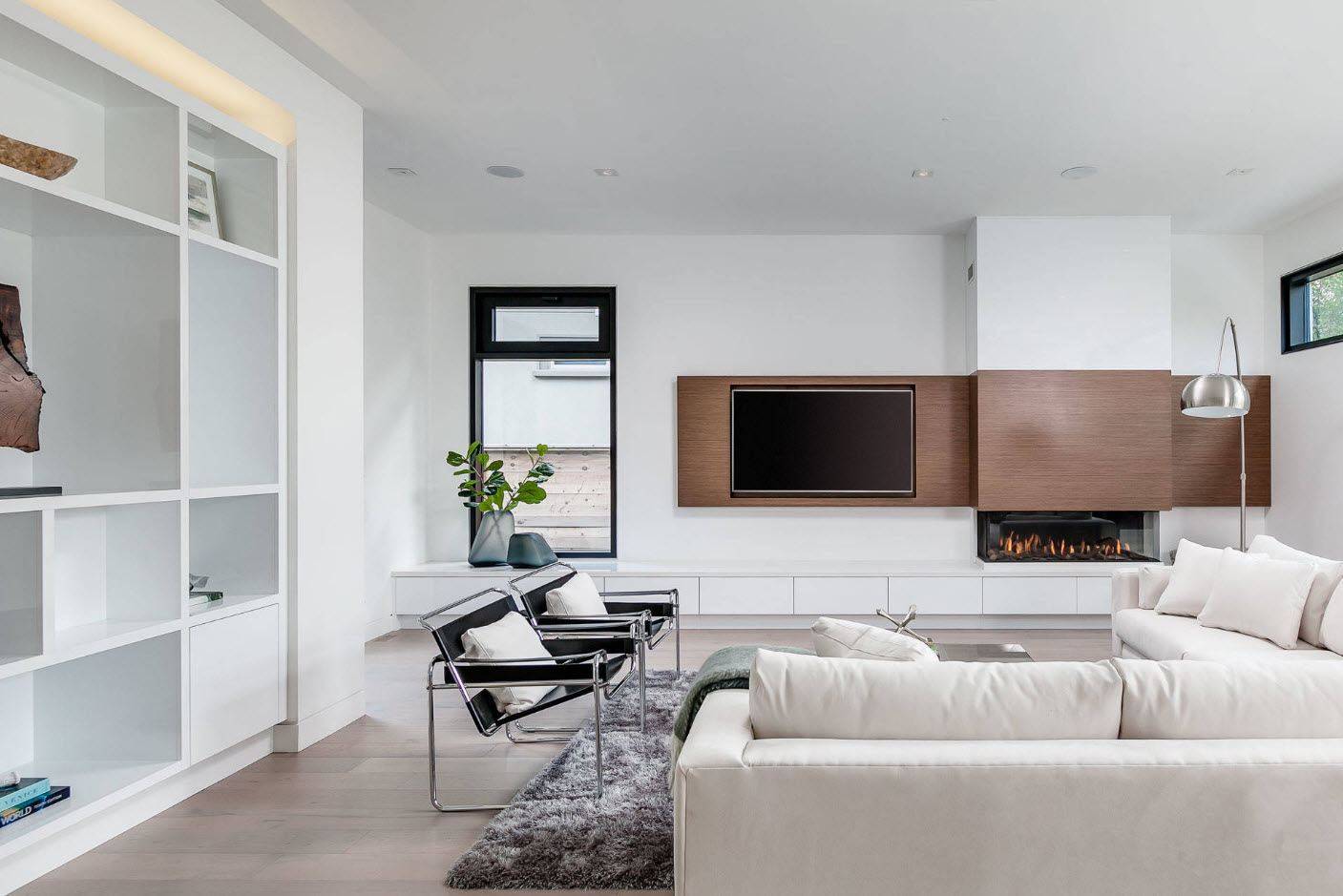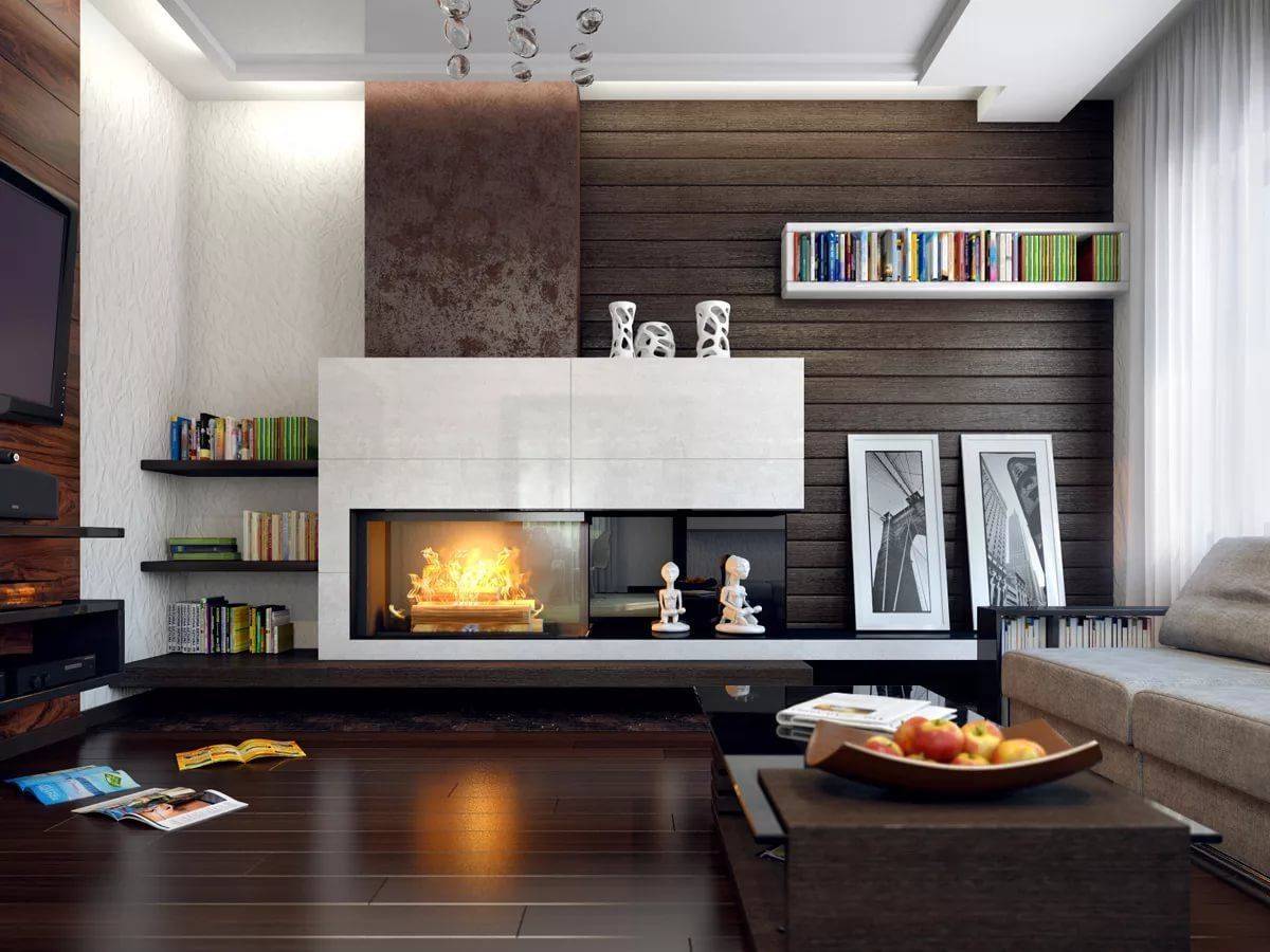 Если площадь комнаты позволяет, то ее рекомендуется дополнить камином. Этот символ домашнего очага может быть как действующим, так и искусной имитацией. Красивые гостиные с камином отличаются особой атмосферой, и производят потрясающее впечатление.