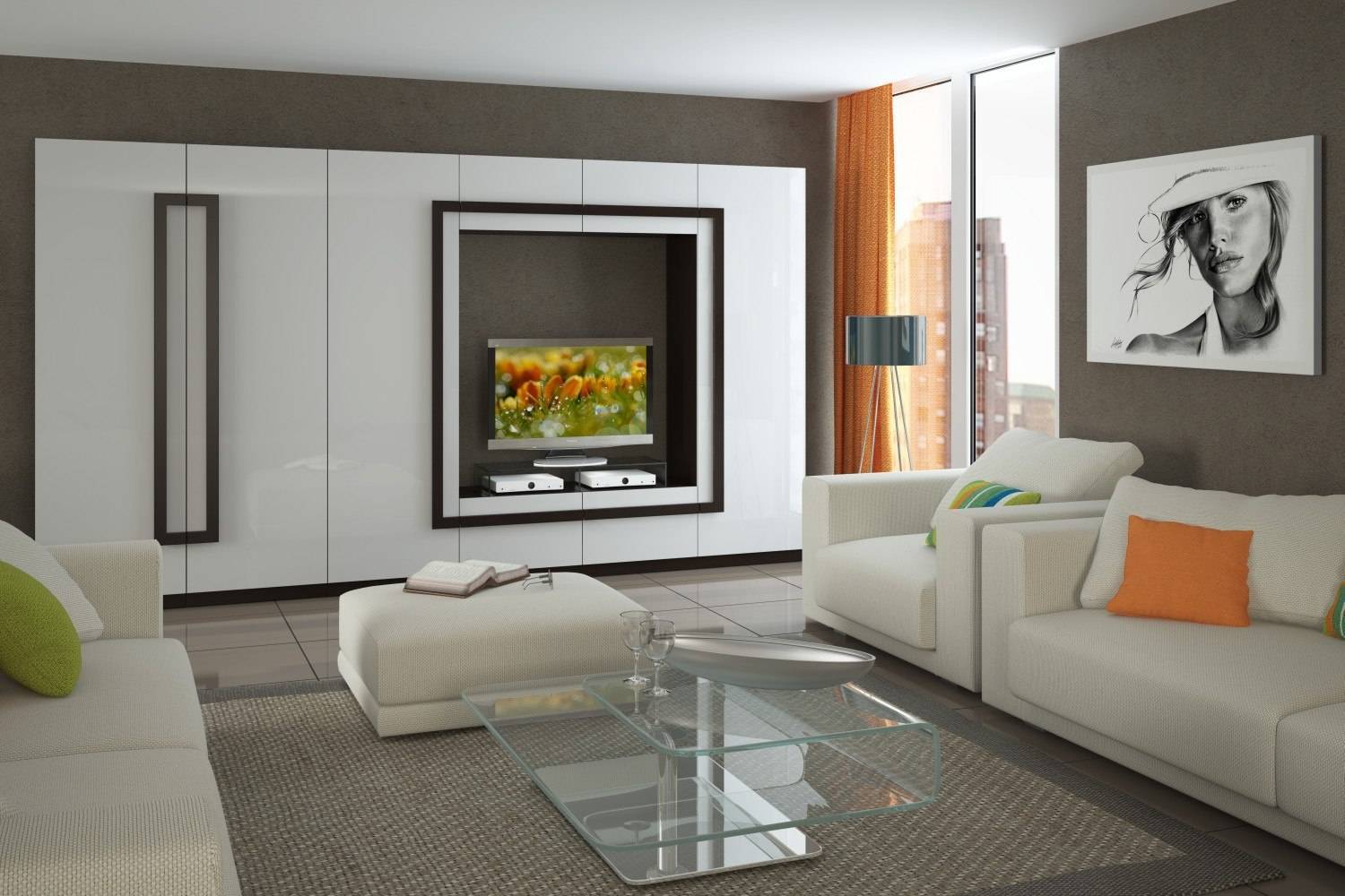 - Белый, серый или черный в гостиной могут быть базовыми цветами, которые дополняются желтым или оранжевым; красным или зеленым.
