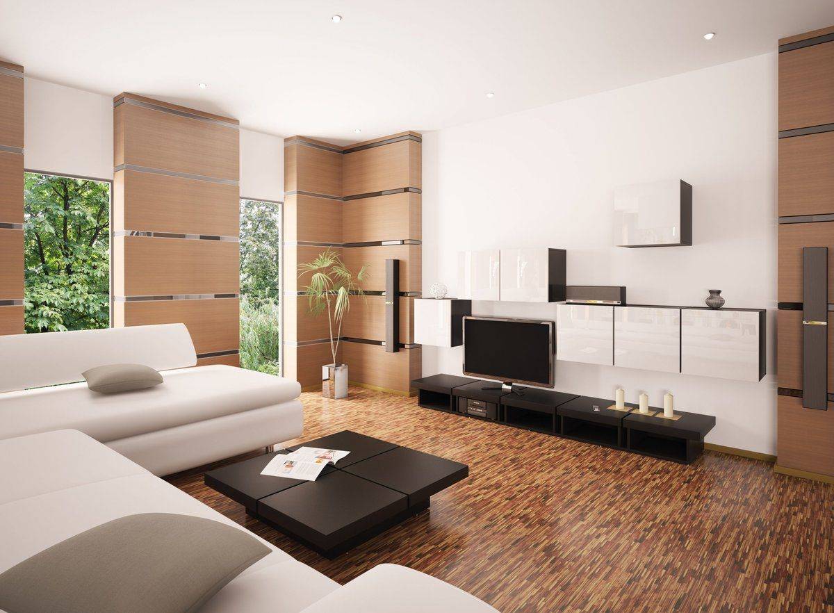 Классическими покрытиями для пола гостиной являются плитка, паркет и ламинат.