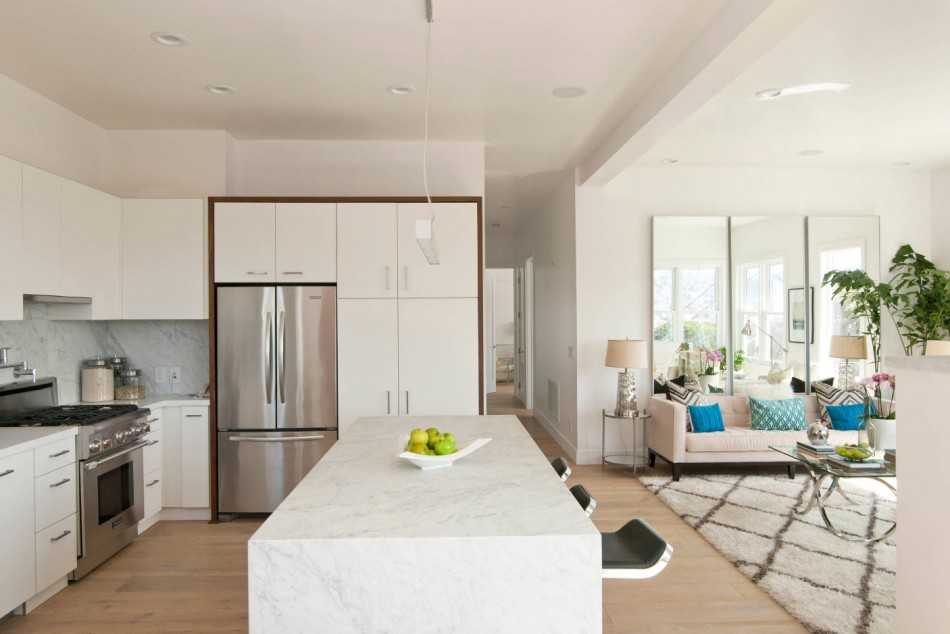 В последнее время достаточно актуальной тенденцией является комбинирование кухни, а также гостиной. Подобный интерьер будет обязательно смотреться не только невероятно привлекательно, но и весьма интересно. С помощью такого приема можно зрительно немного расширить пространство.