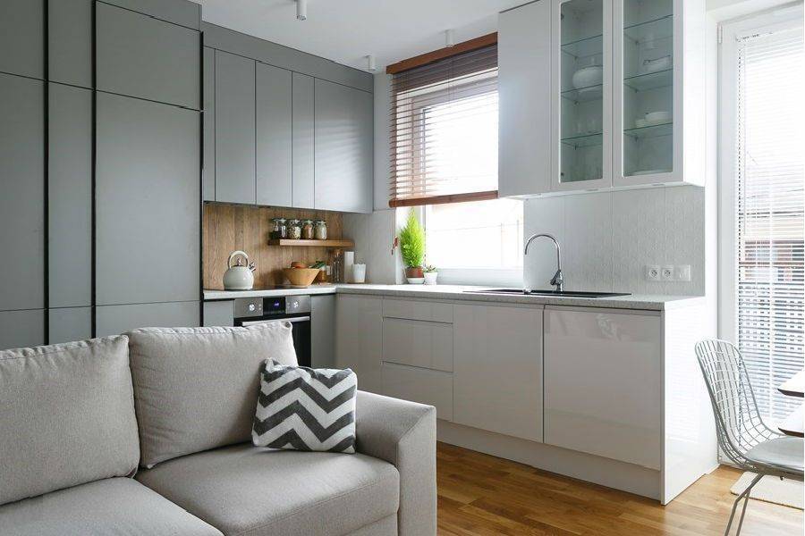 Альтернативой современным серым кухням является привнесение в интерьер как белых, так и черных акцентов. Черная раковина, фоторамки или лампа в виде лампочек на длинном черном кабеле отлично впишутся в серо-белую кухню. Прохладные цвета будут относиться к современному дизайну и лабораторным интерьерам. Поклонникам минимализма, которые выбирают эргономичные решения, также понравится бело-серый глянцевый дизайн кухни.