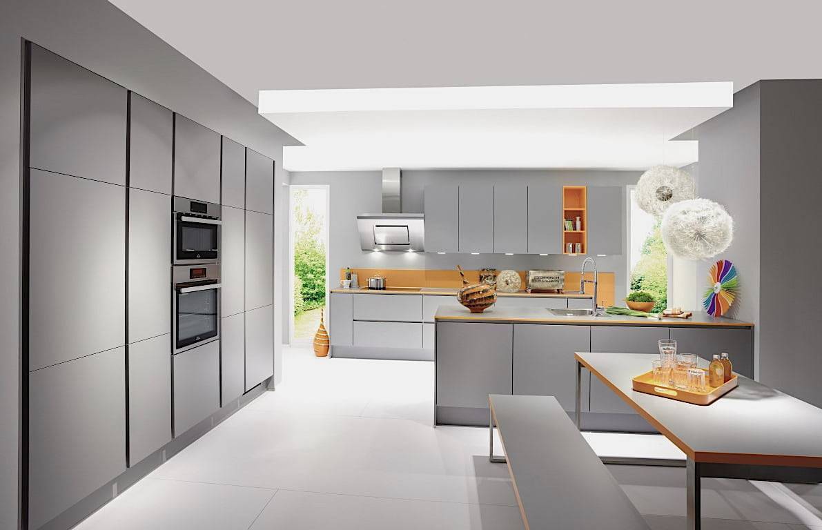 Белой и серой кухне также можно придать современный характер. Это достигается с помощью: