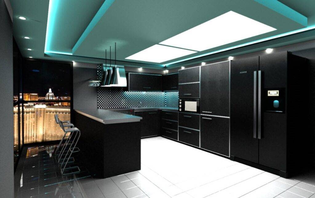 Красиво смотрится композиция из гипсокартона, обрамленная точечными светильниками. Дополнительно, в нишу между стеной и потолком устанавливают светодиодную ленту. Такое решение придает легкости. Используйте разную цветовую температуру при выборе светильников. В магазине встречаются как лампы теплого свечения, так и холодного. Для кухонных помещений, отделанных в стиле Хай-Тек, больше подойдет высокая световая температура (синее свечение).