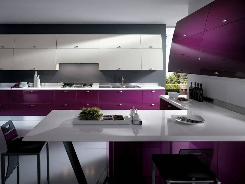 В кухонном гарнитуре должна быть исключительно встроенная техника. Это сделано в угоду эстетике кухни: ровные поверхности, отражающие свет от ламп. Чтобы вся техника стала единым целым с кухонным гарнитуром. Хорошо вписывается барная стойка с высокими стульями и стеклянным столом. Выбирать стулья нужно исходя из лаконичности дизайна и легкости конструкции. Так же они должны подходить по цветовой гамме и не быть слишком большими, чтобы не утяжелять пространство. Если кухня достаточно большая, ее можно оборудовать дополнительным островом с варочной панелью и мойкой.