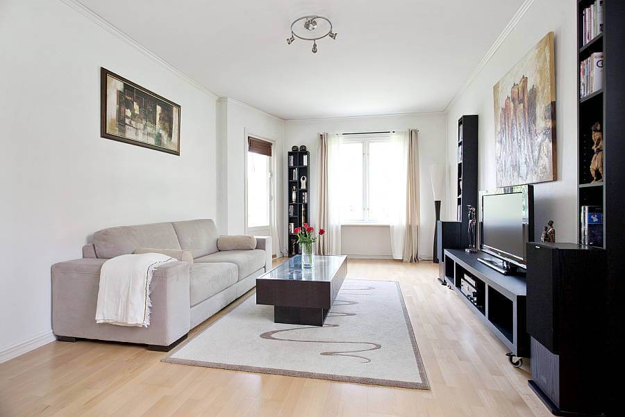Если гостиная не совмещена с кухней, допустимо использование любых материалов для отделки пола. Вы можете постелить на пол ламинат, линолеум, паркет или ковролин. Украсить пол можно с помощью ковров, однако, стоит помнить, что ворсистая поверхность требует более тщательного ухода.