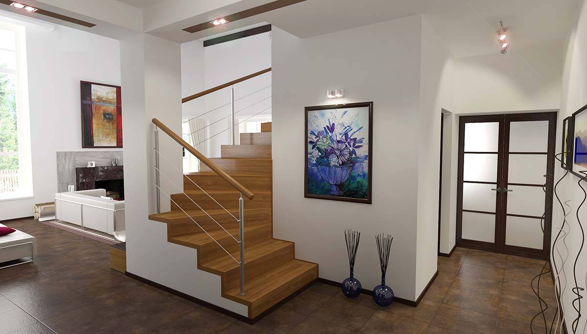 При помощи лестницы правильного вида и формы можно визуально приподнять потолок.