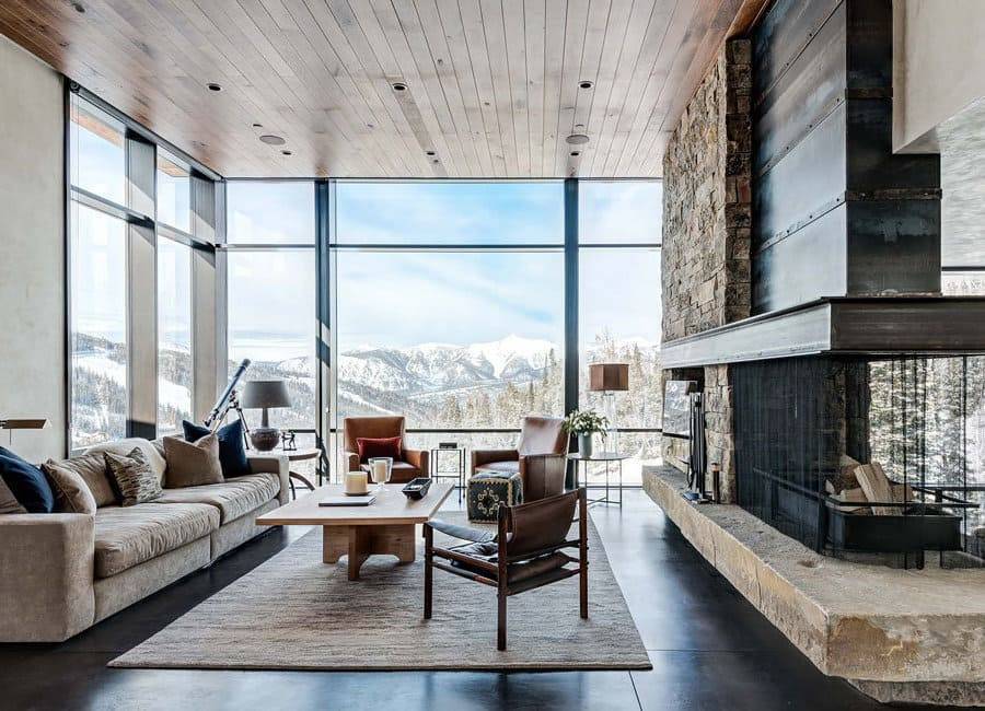 - Окна. Панорамные, по максимуму большие. Раньше пастухи делали маленькие окошки. Это требовалось для сохранения тепла. Сегодня оконные проемы делают большими, чтобы наслаждаться красотой природы. Новейшие технологии позволяют экономно объединить внутренний декор и прелести рельефа местности.