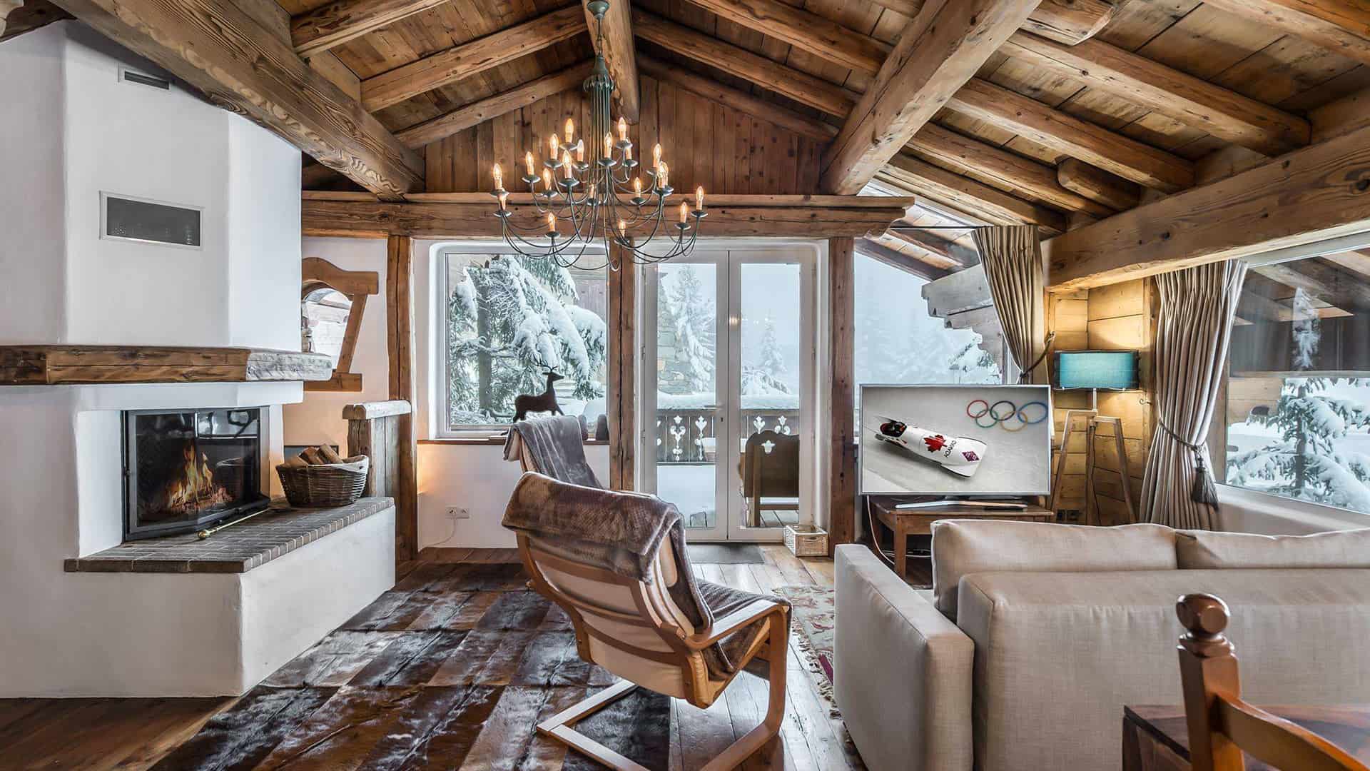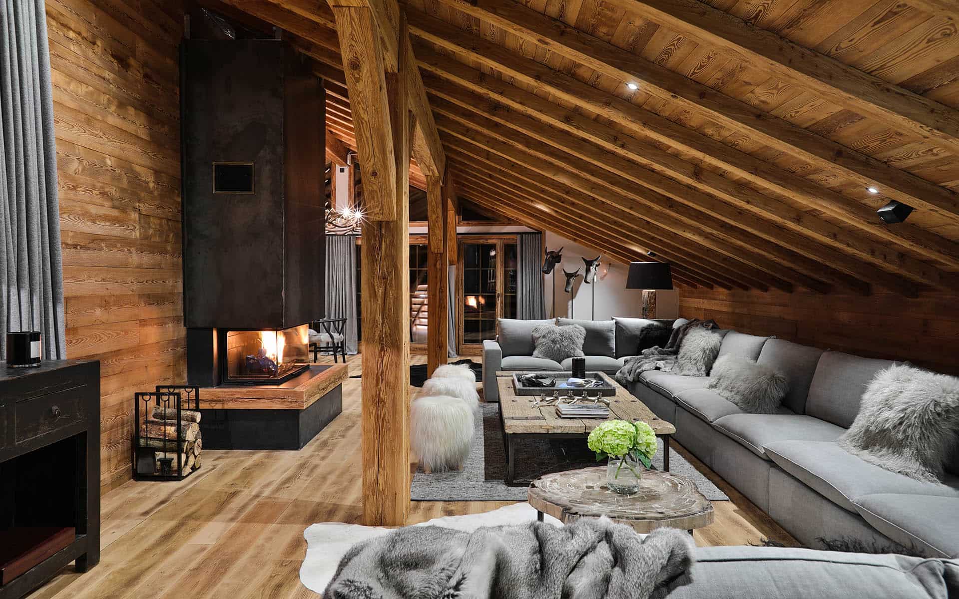 Гостиные шале создают теплую атмосферу домашнего огня. Доминирующие цвета — красный и зеленый. Стены из балок, деревянные полы и потолки, скрипучие лестницы и массивные, часто резные поручни — это основа горных интерьеров. Сердцем дома является, конечно же, камин — кирпичный, а чаще всего чугунный. Свечение огня дополнительно согревает интерьер и заставляет дом быть более уютным и безопасным.