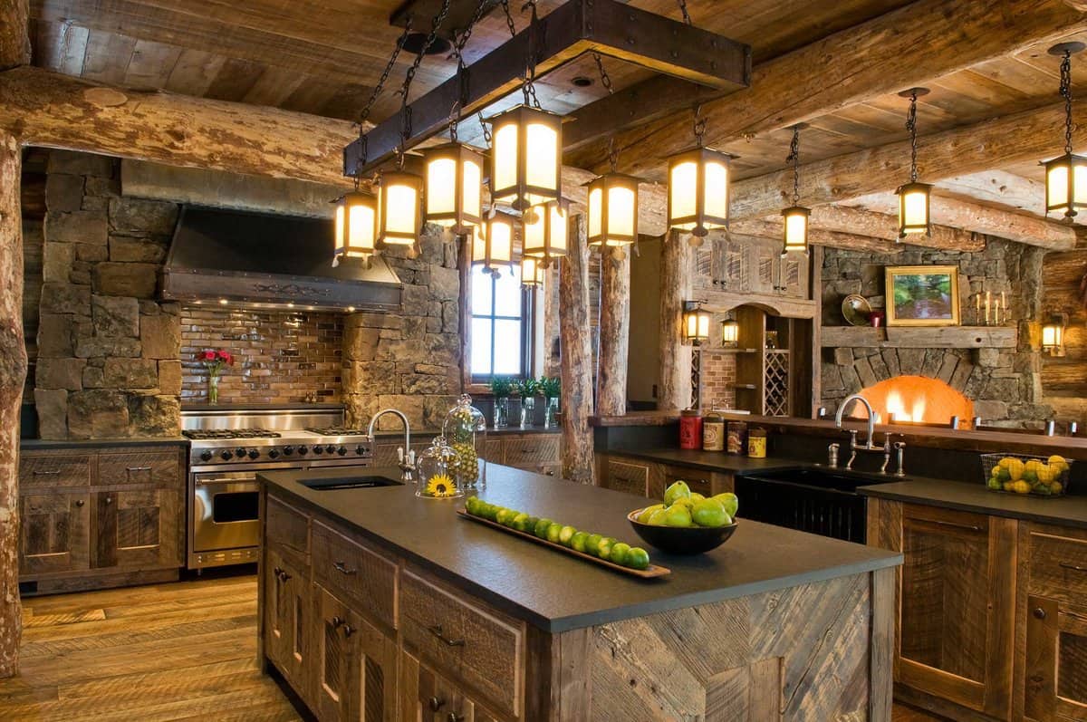 Потолочные светильники и люстры в доме шале должны выглядеть как старинные лампады