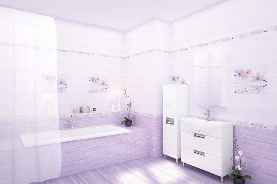 Эта палитра считается женской, особенно когда выбраны лиловые и пурпурные оттенки. А если включить в оформление розовые тона, то ванная будет напоминать помещение для юной принцессы.