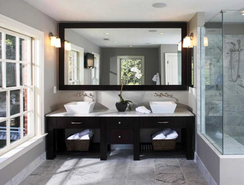 Большое зеркало в тонкой рамочке украсят классическую ванную комнату с душевой