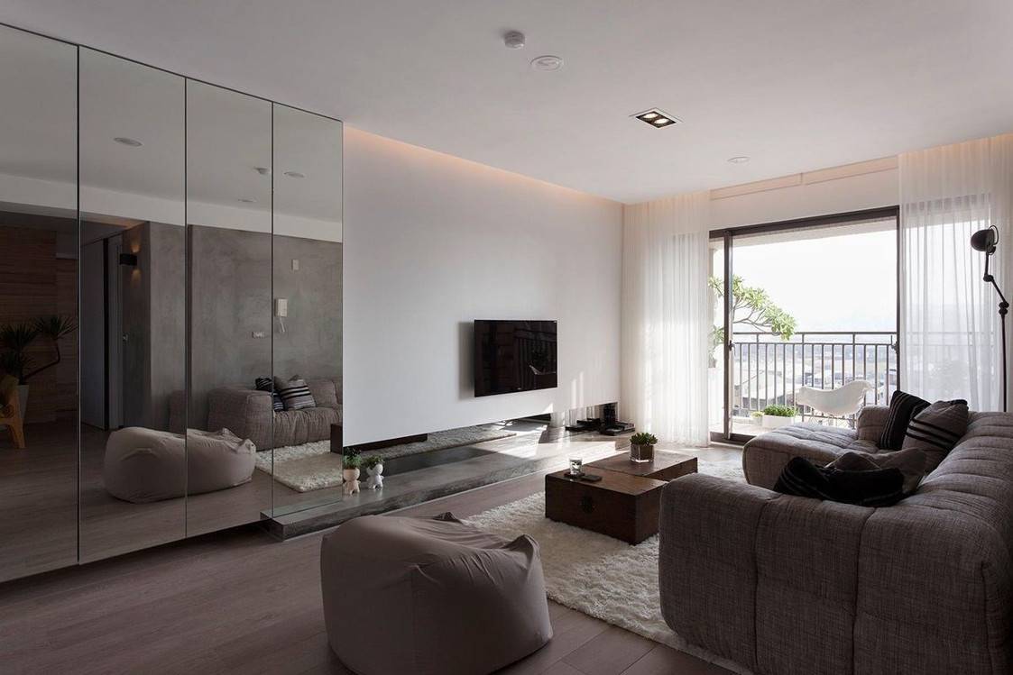 Минималистическая монохромная и не контрастная отделка стен, пола, потолка дает неограниченную свободу выбора и размещения модульной мебели, встроенных шкафов, трансформеров.