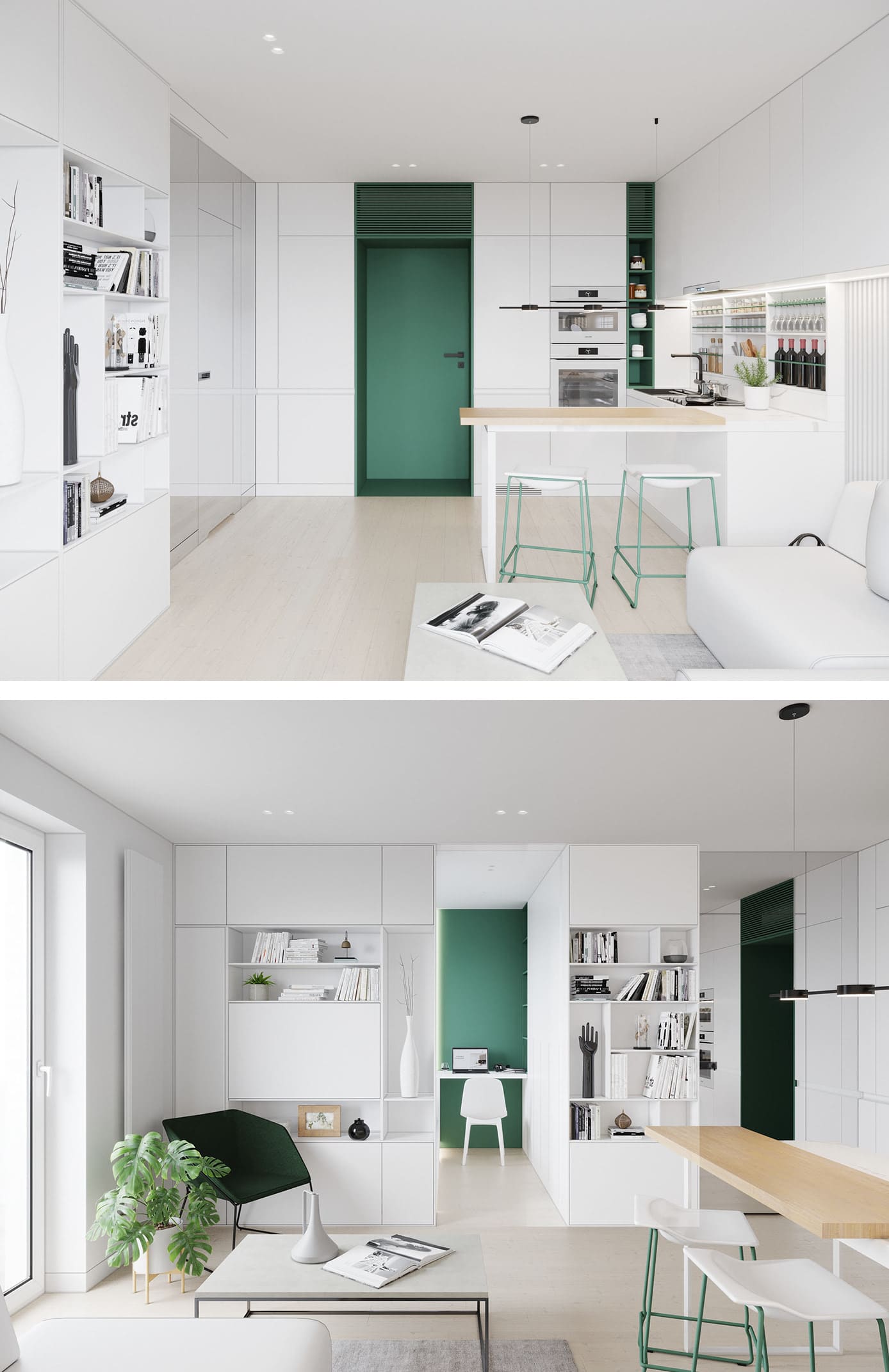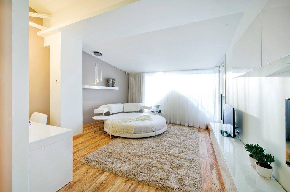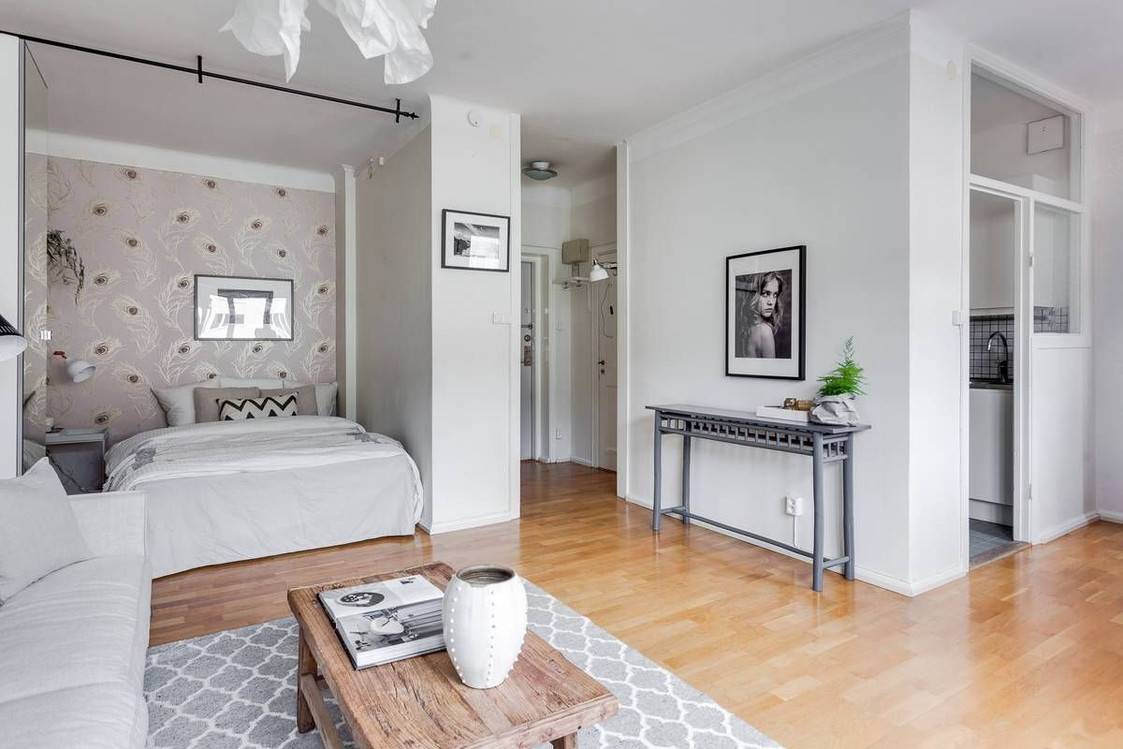 Белоснежные обои в квартире-студии позволяют сделать помещение более просторным. К слову, такой цвет хорошо совместим практически с любыми тонами.