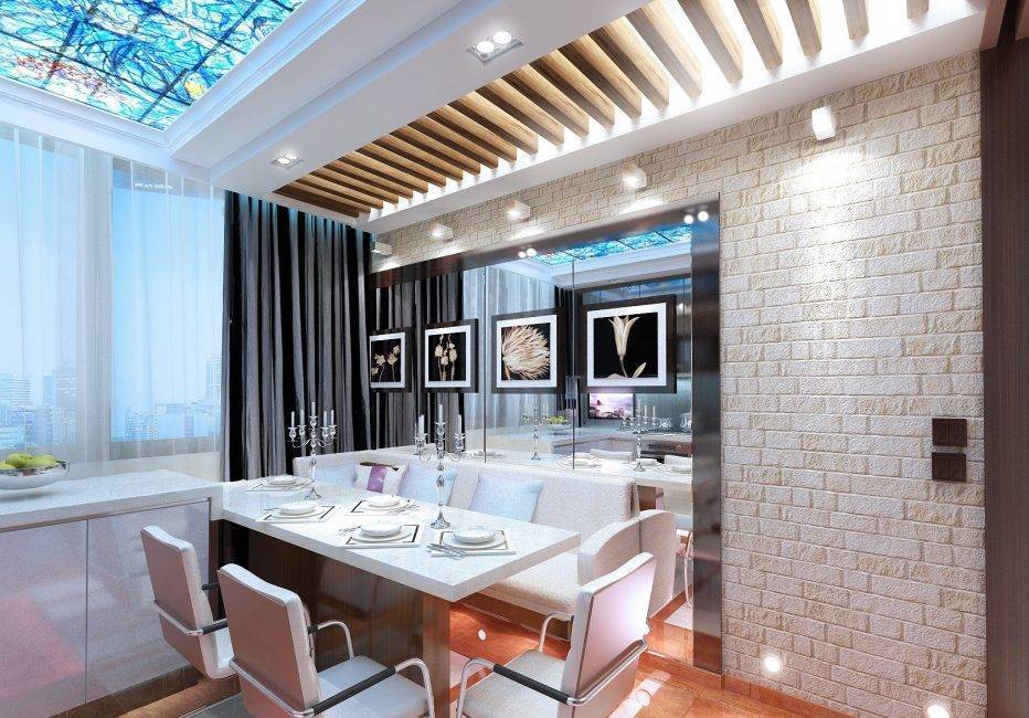 Особое внимание уделяется маскировке кухонной стенки под общий дизайн. Неповторимость интерьера подчеркивается ярким акцентным цветом обивки, фрагментной отделкой, осветительными приборами