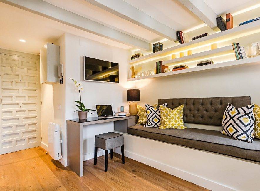 Если размер недавно приобретённой вами студии 27 кв. м. и меньше, на помощь придёт мебель-трансформер. Она отличается высокой функциональностью, занимает минимум места, органично вписывается в любой интерьер.