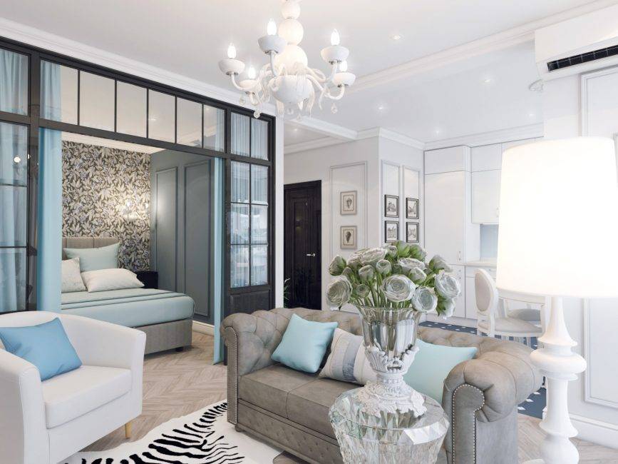 Чтобы помещение было комфортным, в таких студиях необходимо зонирование. Для выделения зоны сна или отдыха можно установить кровать, отгороженную ширмой. Широкое распространение при создании перегородок получило использование конструкций из оргстекла или гипсокартонных листов. В этом случае предпочтение стоит отдать стеклянным поверхностям, не препятствующим распространению света.