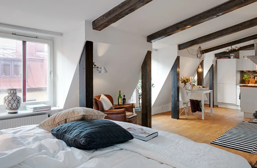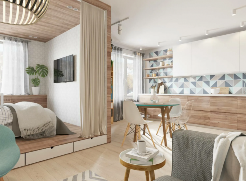 Для того чтобы организовать дополнительное пространство, можно убрать стену, расположенную между кухней и жилой комнатой. Получится современное помещение, которое называется «студия». Отличительная особенность — такая комната совмещает в себе гостиную, кухню, спальню и даже детскую, которые разделены символическими перегородками на функциональные зоны.