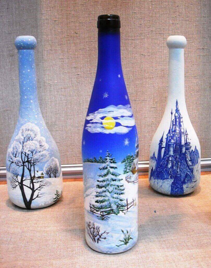 Существует два вида бутылки росписи красками – изнутри и снаружи. Мы предлагаем идей несколько по выполнению поделок с использованием этой Идея.