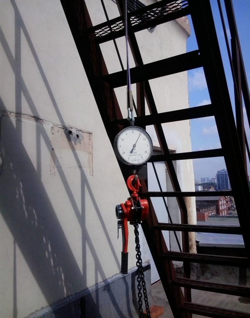 - К ступенькам лестницы в самой середине подвешивается груз. Он должен давить на материал с силой не менее 1,2 кН. «Продержаться» в таком состоянии конструкция должна не меньше двух минут. Если какие-либо ступени выглядят хлипко, то с ними проводят «индивидуальную работу», также подвешивая на них груз и изучая их реакцию.