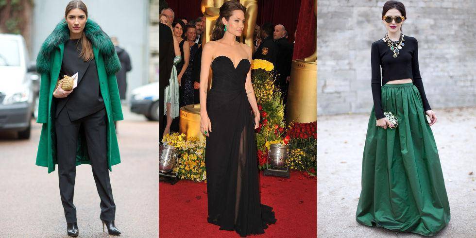 Брюнеткам рекомендуется попробовать вариант образа, который будет состоять из лишь оттенков зеленого цвета — изумрудное платье, аксессуары. Если же такой вариант покажется вам слишком однообразным, то добавьте к нему несколько деталей желтого, золотого или охристого цветов.