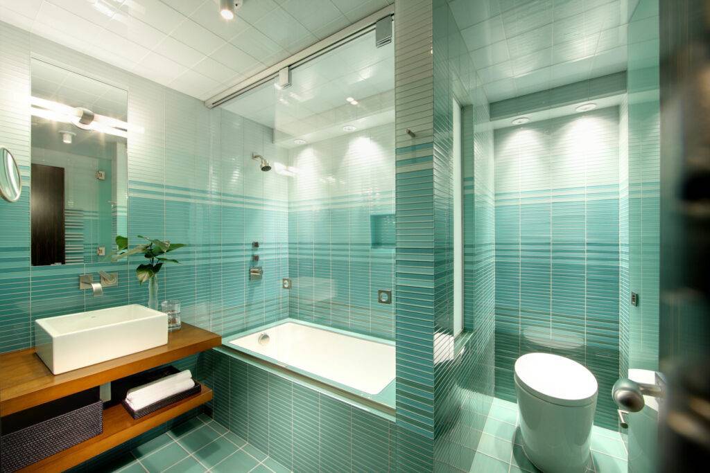 Бирюза и лазурь — всегда свежее и удачное сочетание для санузла