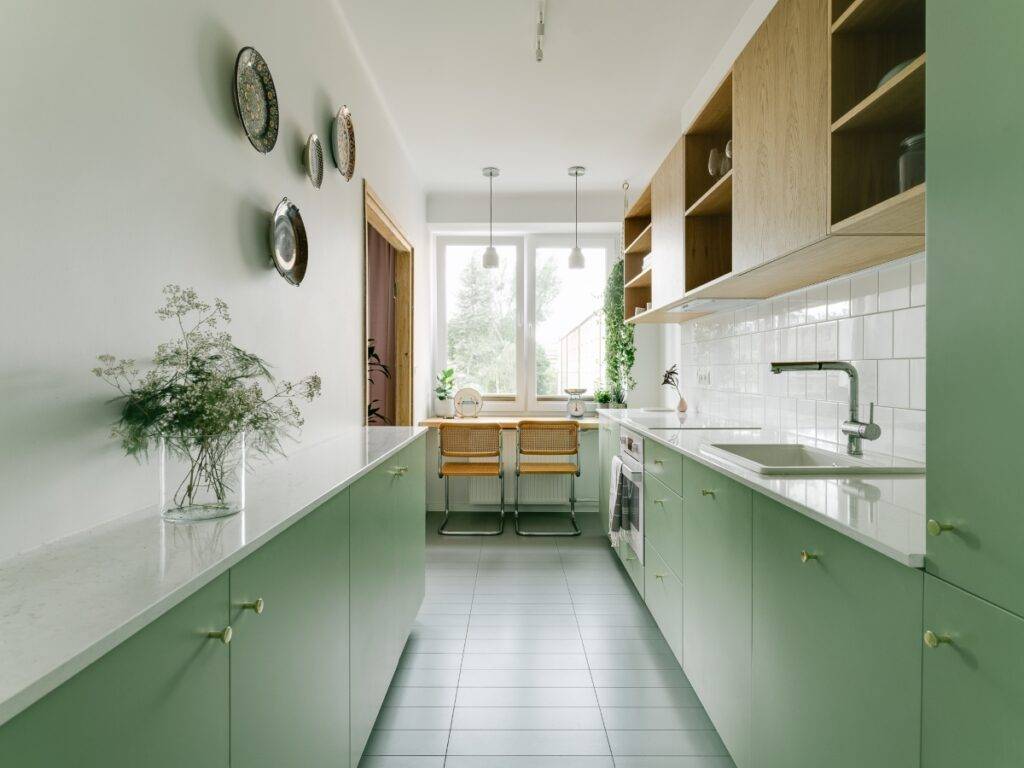 - Покрасьте шкафы в тот же цвет, что и стены. Ограничение кухонного гарнитура и цвета стен до одного оттенка стирает визуальные границы самой кухни.