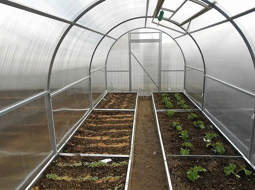 - Если теплица длинная и имеет ширину в два метра, лучше сделать две грядки шириной в 600-700 мм, отделенные друг от друга проходом в 600-800 мм.