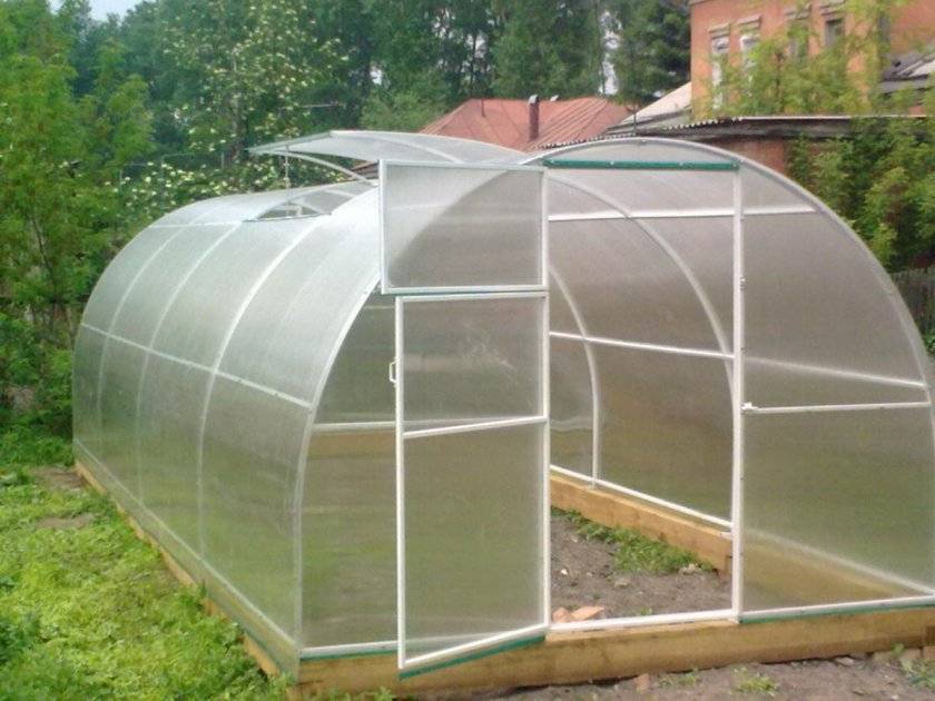 Наличие перегородки необходимо при соседстве не совсем дружественных растений. Глухая поликарбонатная перегородка с дверью надежно отгородит разные растения. Перегородку без двери используют при выращивании помидор, поскольку им необходима постоянная циркуляция воздуха в сооружении. Если отсутствует возможность установки поликарбонатной перегородки, её заменяет пленка, натянутая на каркас.