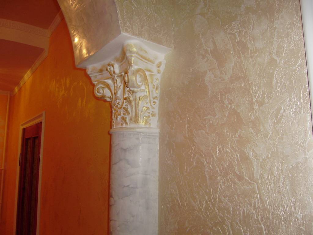 Венецианская. Состав такого материала включает мраморную муку, которая создает ощущение присутствия мраморного камня на поверхности. Она также содержит водную эмульсию и гашеную известь.