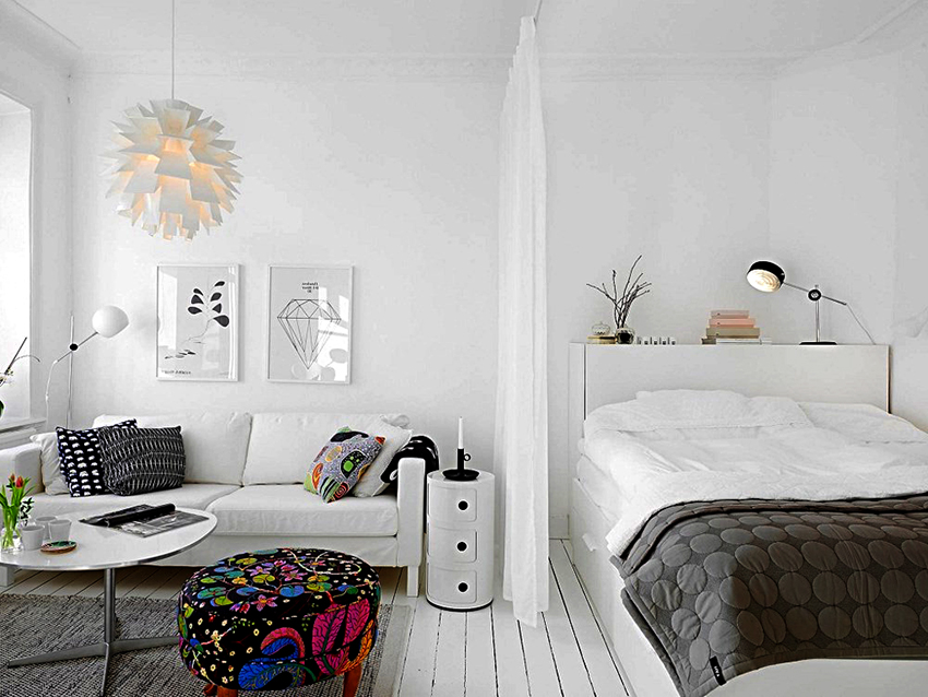 Помимо грамотного использования пространства не стоит забывать об отделке. В маленьких комнатах стоит избегать тёмных и кричащих цветов. Отделка стен, пола и потолка должна быть светлой, а вот аксессуары могут быть разных цветов. Для малогабаритной спальни-гостиной потребуется хорошее искусственное освещение — чем больше света, тем просторнее кажется комната.