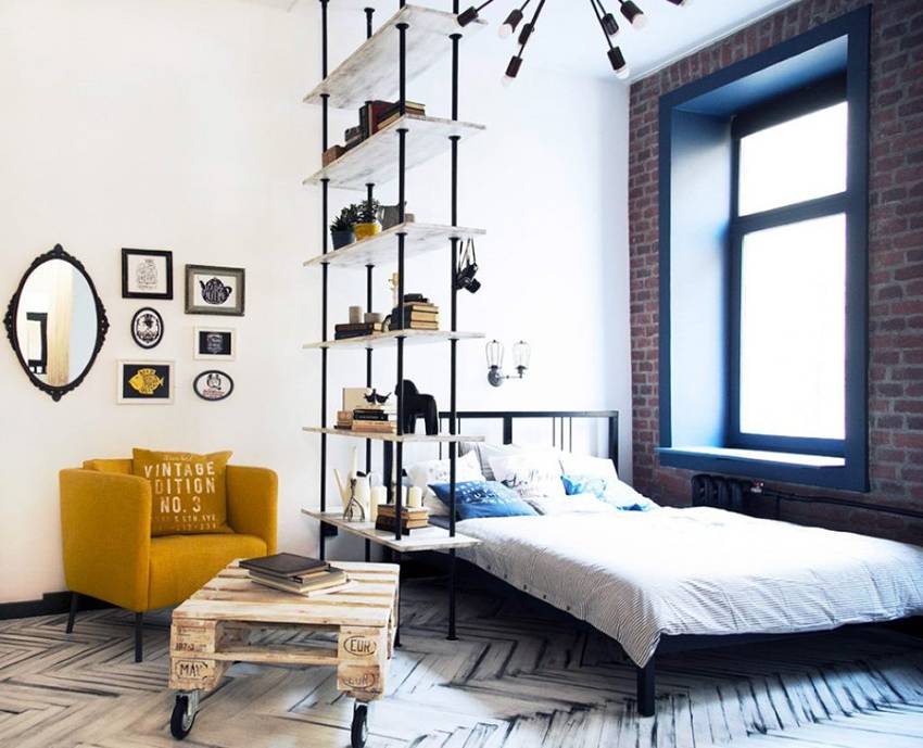 Для совмещенной спальни и гостиной можно использовать полку как перегородку